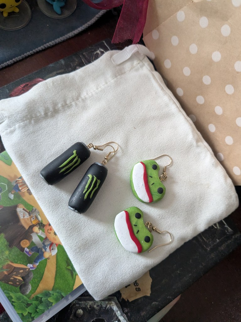 As I mentioned earlier, clay was the theme for our latest craft night. In the time it took my friend to make 3 or 4 really neat key caps and a button, I managed to make a simple pair of earrings. When thinking of a design my brain likes to go to the things I already know and like- and what do I like more than good old Monster energy drinks. Naturally I need to show my love for them by wearing miniature versions on my ears.